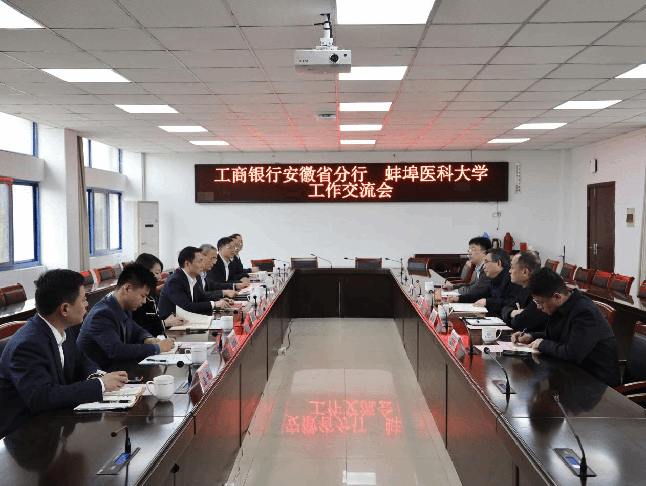 3月25日下午,工商银行安徽省分行党委委员副行长宋磊、省分行高级专家兼养老金融部主要负责人苑卫东、工商银行蚌埠分行党委书记行长许含芝一行来校开展工作交流。校党委书记朱立军、校党委常委第二附属医院党委书记高恒,以及校财务处、第一附属医院相关负责人参加座谈。